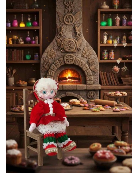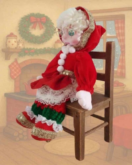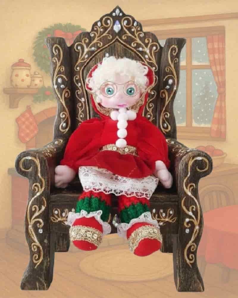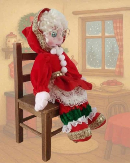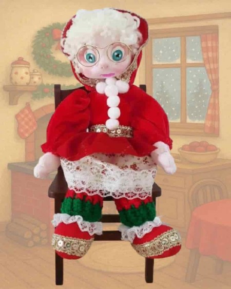 Artesanía navideña única: Señora Claus de tela con gafas y detalles bordados.